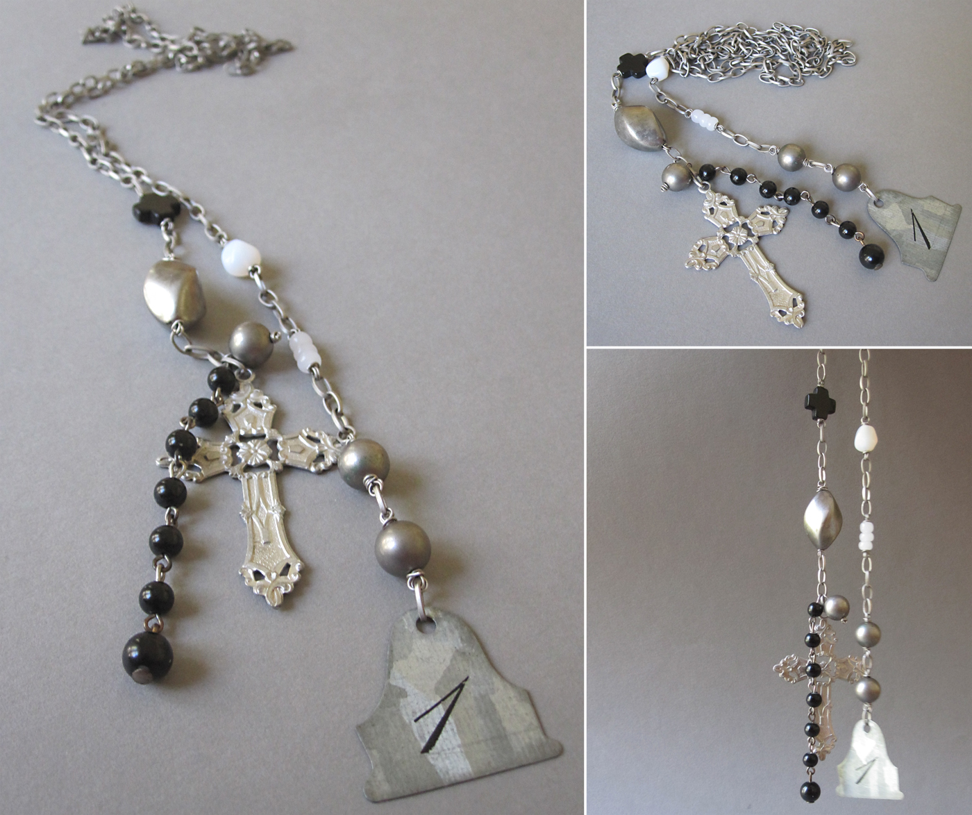 My first piece is a lariat style necklace. With a Christian feel to it. I made quite a few alterations along the way, working with the colors, to create something interesting. Trying to figure this, for me, new thing out (the color scheme). I've used almost only stuff from Susie's soup, adding only a few milky white glass beads, and the black glass cross.